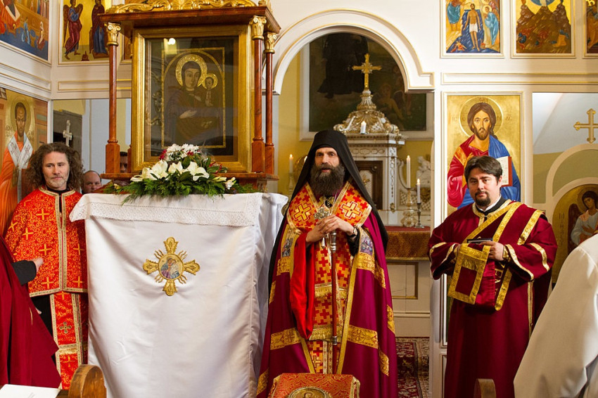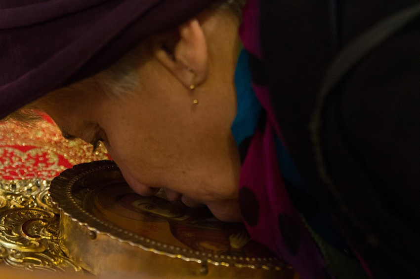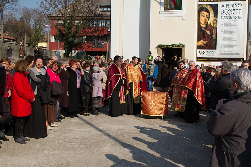Az ikon Veszprémből érkezett Baranya megye székhelyére, először a Xavéri Szent Ferenc görögkatolikus templomba, ahol hívők sokasága várta, és Kocsis Fülöp hajdúdorogi megyéspüspök vezetett parakliszt. (Paraklisz: könyörgő ájtatosság az Istenszülő Szűz Máriához. A görög παράκλησις ’odahívás, segítségül hívás, kérés; buzdítás, felszólítás; vigasztalás’ szóból – a szerk.)