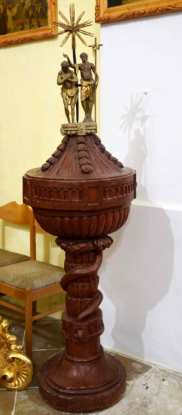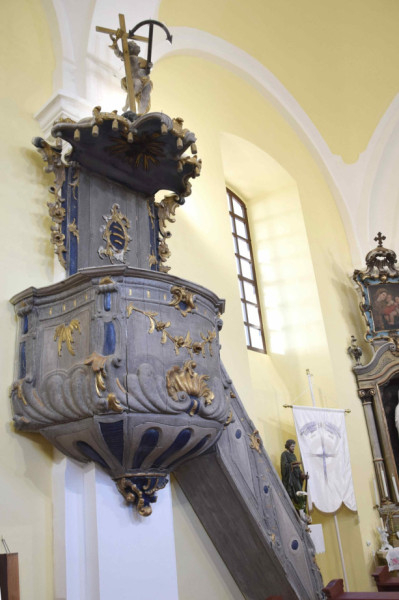 A berendezés több kvalitásos darabbal büszkélkedhet. Ilyen a fából faragott, de vörös márványt utánzó festésű (feltehetően felülfestett) keresztelőmedence, fedelén Jézusnak a Jordánban való megkeresztelését ábrázoló faszoborral. A barokk stallum és szószék mára kissé megkopott, de eredetileg márványt imitáló kékesszürke festésű fa berendezési tárgy, amelyet kék betétek, aranyozott kagylómotívumok és virágfüzérek díszítenek, a hangvető alján a Szentlélek galamb alakban, felette egy puttó szobra, aki a keresztet tartja, jobbjában kehely és gabonaszál, balljában horgony. Említésre méltó a két 19. századi mellékoltár: délen Szent Vendelé, északon Szűz Máriáé.