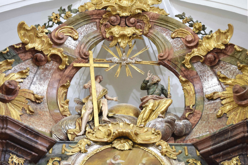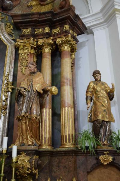 A legjelentősebb műtárgy a barokk főoltár: a szentély teljes terét kitöltő faragott fa építmény architektonikus szerkezetű. A koporsó alakú menza és a nyitott kupolával koronázott pasztofórium mögött íves térfalat képez a háromrészes építmény. Alsó zónáját magas lábazatként kezelték, szélső szakaszai a szentély oldalfalához csatlakoznak, egy-egy ajtó nyílik rajtuk az oltár és fal közötti keskeny térbe. Közép felé két-két oszlopszék, majd egy-egy díszes volutás konzol következik, előbbi felett két-két szabadon álló oszlop és közép felé kettős pilaszterek. Az ajtók, illetve a konzolok felett két-két szent közel életnagyságú álló szobra található: Szent József, és Nepomuki Szent János, kezében a feszülettel, és egy-egy diakónusi öltözetű, ma attribútum nélküli alak, az utóbbi mellett állót Szent István protomártírral azonosítják. Az oltárépítmény e második zónáját a támaszok helyzetének megfelelő tagolt háromrészes párkány zárja.