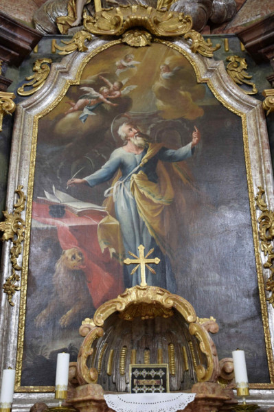 A barokk oltárkép festőjének nevét nem ismerjük, jóllehet a kép jó kvalitású 18. századi munka. Szent Márk evangélistát írópulpitus előtt állva ábrázolja, lábánál szimbóluma, az oroszlán, előtte nyitott könyv – az evangélium – és tintatartó, jobbjában toll, bal kezével felfelé mutat, ahová tekintete néz. Felette felhők közt puttók, míg az alak és környezete sötét épített háttér előtt jelenik meg, a felső régiót Márk és az oroszlán tekintetének irányából, jobb fentről érkező fénysugarak világítják meg. A kompozíció igen régi ikonográfiai hagyományba illeszkedik: már Karoling-kori miniatúráknak is gyakori témája az író evangélista, aki isteni sugallatra foglalja írásba Jézus életét. Szemléletesen, korának festészeti eszközeivel fogalmazza ezt meg a barokk oltárkép.
