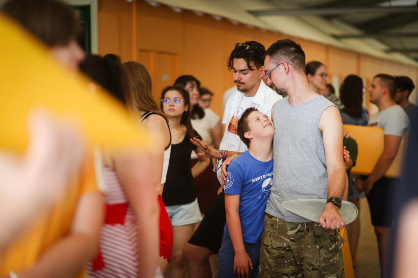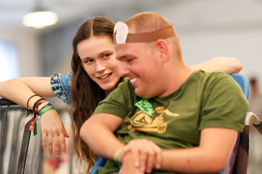 Látszik, hogy mindenkire jut segítő, van, akit kerekesszékben tolnak, másokat kézen fogva vezetnek, vagy csak kísérnek. Robi elmondja, hogy egy csoportban általában tíz segítőre jut hét táborozó.