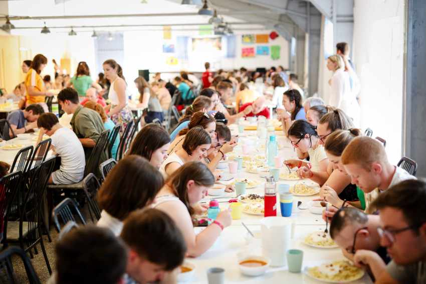 A hűs ebédlőben lassan gyülekezni kezdenek a népek, de még mindig tart a buli, többen a Boney M. dalára, a Raszputyinra táncolnak. Két táborlakó a színpadon mikrofonba énekel. Kis idő elteltével imádság következik a szervezők vezetésével, majd csoportokban mindenki leül ebédelni. Van, akit etetni kell, türelmesen, kedvesen.