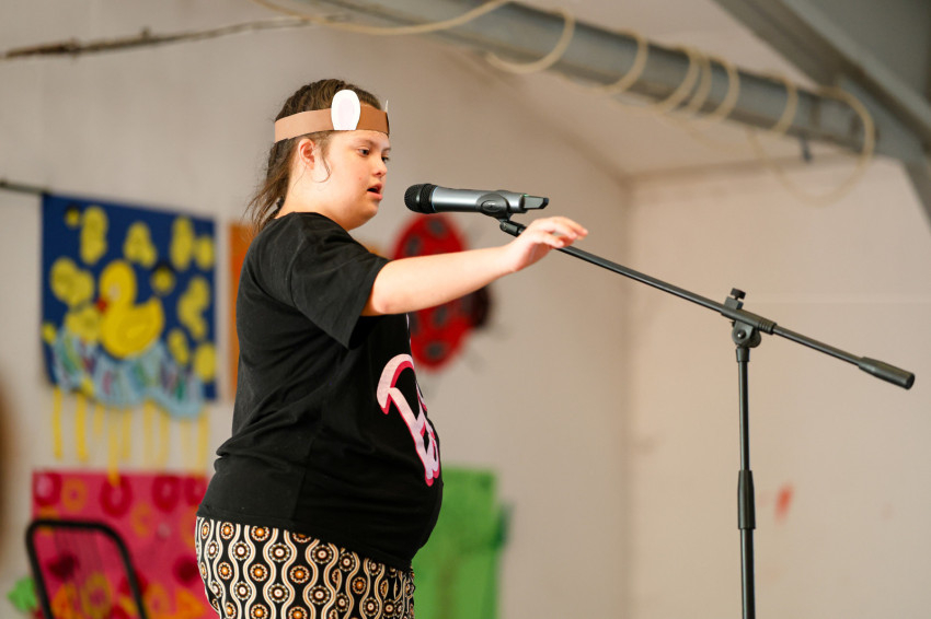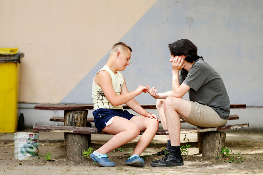 Csúcs Borbála szintén segítőként érkezett a táborba, a Down-szindrómás testvérét kísérte el. Éppen rajzolnak egy szaletli alatt, míg mások gyöngyöt fűznek. Általában együtt van a csapat, ők a sötétkékek. Bori háromszor volt már táborban a testvérével, aki most tizennégy éves, és otthon is emlegetni szokta ezt a felejthetetlen élményt. A segítők is tartják a kapcsolatot egymással év közben – tudom meg Boritól.