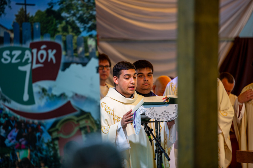 Homíliájában Szedmák Zoltán újmisés Isten zarándok népének nevezte a Szalókra érkező résztvevőket. Majd kegyelemről és bűnről, illetve döntésről és hitről elmélkedett. Talán Egerszalókot „a kegyelem szigetének” is nevezhetnénk – mondta. A temető mellett található sátortábor kapcsán megjegyezte: a minket szerető Isten is a halál helyén, az örök életet elvesztett ember lakóhelyén, itt a földön verte fel az ő sátrát. És ma is itt sátorozik közöttünk. Itt lakik velünk, nem szedte a sátorfáját és távozott el tőlünk, és ezt tapasztaljuk különösen itt, a kegyelem szigetén. Nem lehet lekicsinyelni a bűnt, számolni kell vele. De nem lehet az életünket úgy élni, hogy csak a bűnre koncentrálunk. Ha a kegyelemre figyelünk, ha arra figyelünk, hogy minél inkább betöltekezzünk Istennel, akkor a kegyelem által közel kerülünk hozzá, és egyre távolabb kerülünk a bűntől. Isten válasza az ember megmentése. Isten válasza az irgalom: a leginkább és a legkönnyebben megérezhetjük, hogy ott van Isten az irgalom mögött.