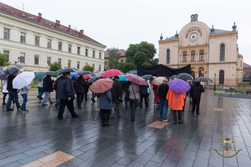 Az emlékezők menete a ferencesek templomától indult el a pécsi zsinagóga felé. A zsinagógában Udvardy György megyéspüspök és Schweitzer Gábor jogtörténész mondott beszédet.