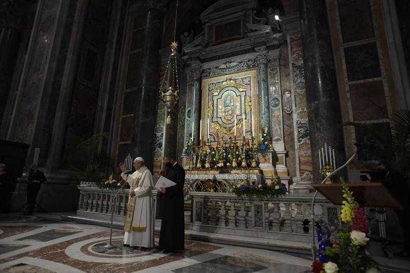 „Segítő Szűzanya, takarj be minket köpenyeddel, és védelmezz minket; adj erőt a megpróbáltatás idején, és töltsd el szívünket a jövőbe vetett remény fényével – fohászkodott Ferenc pápa. – A jelenlegi drámai helyzetben, a szenvedés és aggodalmak közepette, amelyek az egész világot szorongatják, hozzád fordulunk, aki Isten Anyja és a mi Anyánk vagy, és menedéket keresünk a védelmed alatt.”