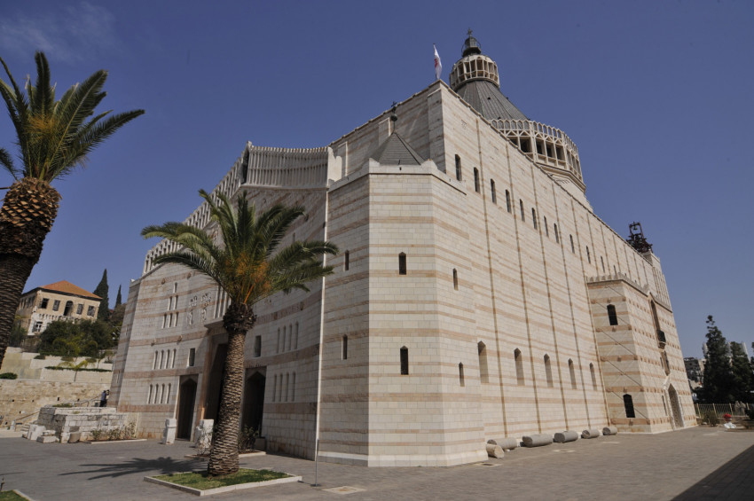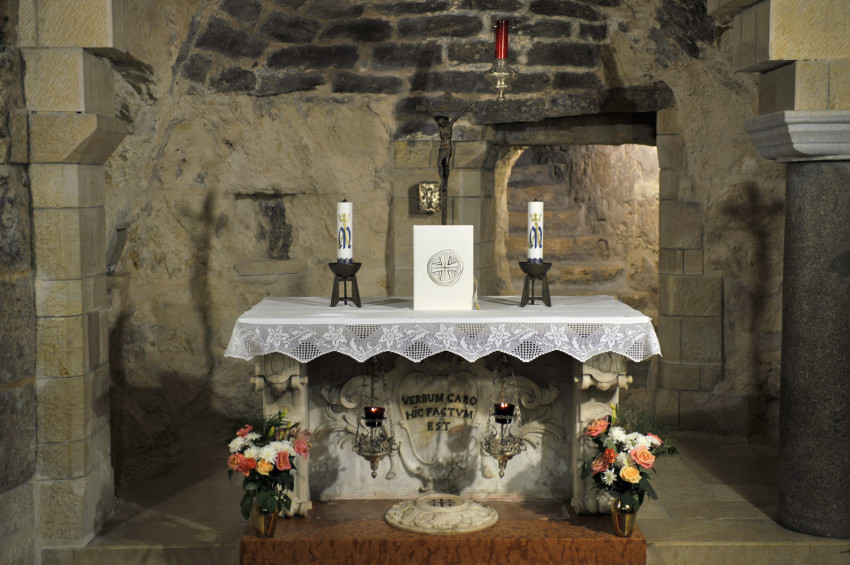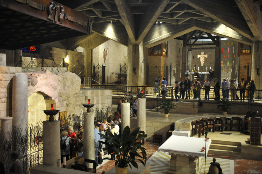 A názáreti zarándoknak érdemes megnéznie a hirdetőtáblát: a keddi rózsafüzéres körmenet és a csütörtöki szentségimádás fix pontjai mellett nemegyszer másfajta esti imádságok lehetőségére is rábukkanhatunk itt. Márpedig naplemente után visszasétálni a bazilikához már önmagában élmény: elmenni Mária kútja mellett (az ortodox hagyomány szerint itt került sor az angyali üdvözletre), esetleg betérni a nagy fűszerbazárba, megmerítkezni a közel-keleti kisváros esteli mozgalmasságában, odaképzelni magunk köré, a mai názáretiek képében, kétezer évvel korábbi eleiket. Szent József, a Szűzanya és a felcseperedő Jézus is ezeken az utcákon, hasonló arcok között járt. Így megérkezve a már csöndes, szelíd fényekkel megvilágított bazilikába: valódi rátalálás. A hatalmas falak spirituális árnyékot vetnek zakatoló, a nap élményeitől elcsigázott agyunkra és ki tudja, hány benyomás által felkavart lelkünkre. Az ima szinte vonzza az embert befelé és lefelé: a grotta irányába. Régi karácsonyi énekünk a betlehemi pusztát idézi: „Az angyal énekel, / tekints az égre fel! / Napvilágos lett az éj, / meghasadt az ég, / és a Második Személy / most a földre lép.” Mielőtt Júdeában bekövetkezett volna a megénekelt csoda, ezen a helyen, „a nagy Betlehem” árnyékában, a csöndes és szerény kis Názáretben már „földre lépett” az Ige. A Fiú örökre, visszavonhatatlanul és beteljesült módon Emmánuelnek bizonyult. Innen, a bazilika mélyéből, alapjától kiindulva egyesült az emberiséggel, velünk levővé vált az Isten.