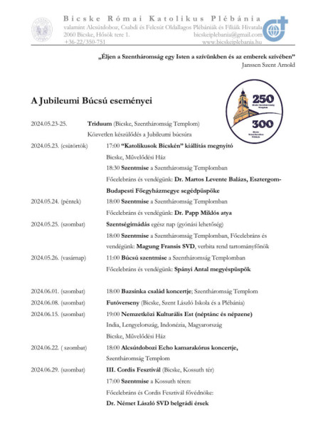 A jubileumi búcsúra triduummal készül a verbiták által vezetett plébánia: május 23-án, csütörtökön az este 6 órakor kezdődő szentmise főcelebránsa Martos Levente Balázs esztergom-budapesti segédpüspök; 24-én, pénteken este Papp Miklós mutat be szentmisét; 25-én, szombaton egész napos szentségimádást tartanak. Aznap este Magung Fransis SVD, a verbita rend tartományfőnöke lesz a plébánia vendége.