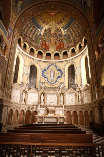 Az altemplomban létesített látogatóközpontban zajlik a kiállítási helyszínek berendezése, az interaktív eszközök elhelyezése. Kívülről még állványokat látunk: a külső homlokzat renoválásának befejezése a következő időszak feladata.