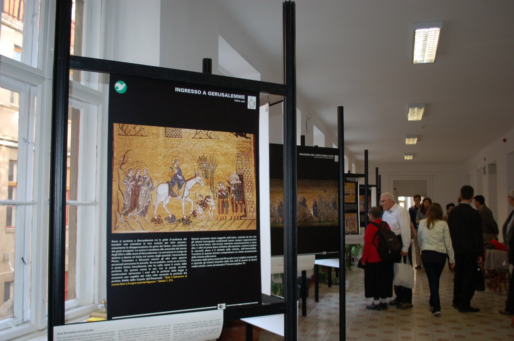 Szuromi Szabolcs, a PPKE rektora nyitotta meg a kiállítást. Többek között felhívta a figyelmet arra a tényre, hogy az eredeti mozaikok helyszínén, a velencei Szent Márk-bazilikában kisebb esélye van rá a látogatónak, hogy ilyen jól megvilágítva, ilyen kényelmesen megcsodálhassa a gyönyörű bizánci stílusú mozaikokat, a Velencei Patriarkátus kincseit.