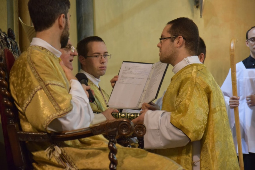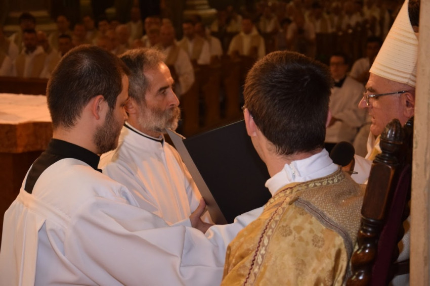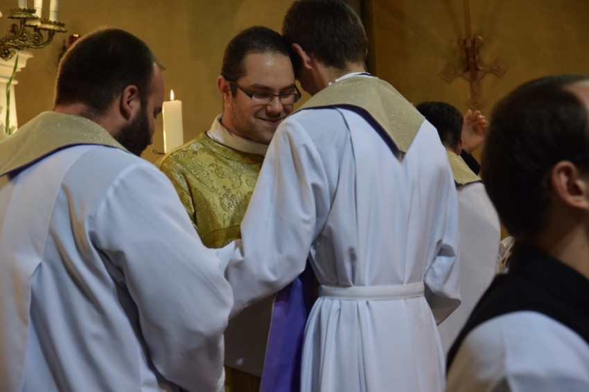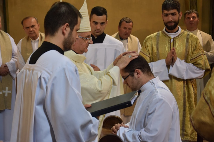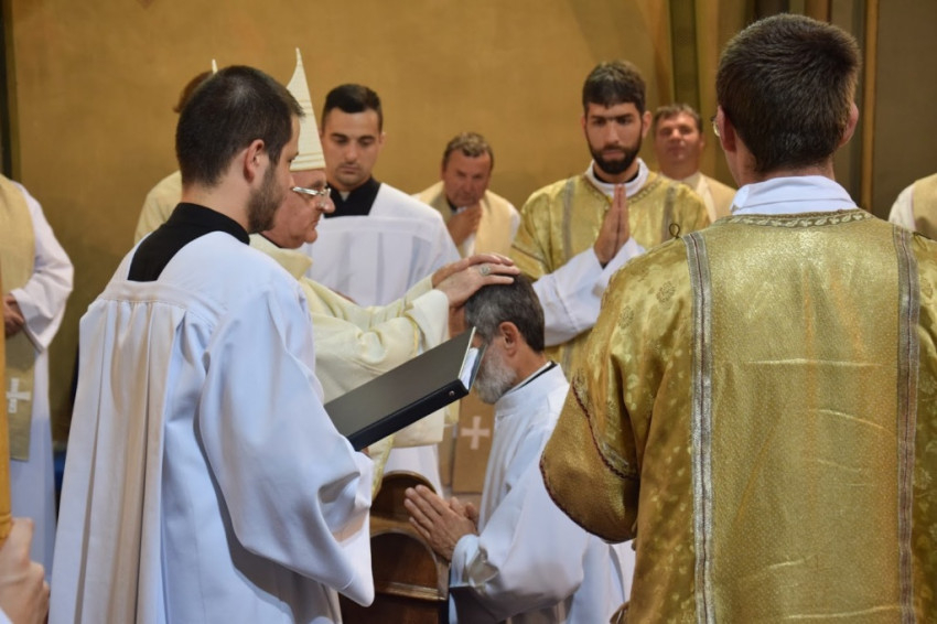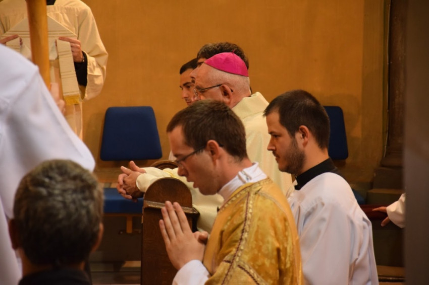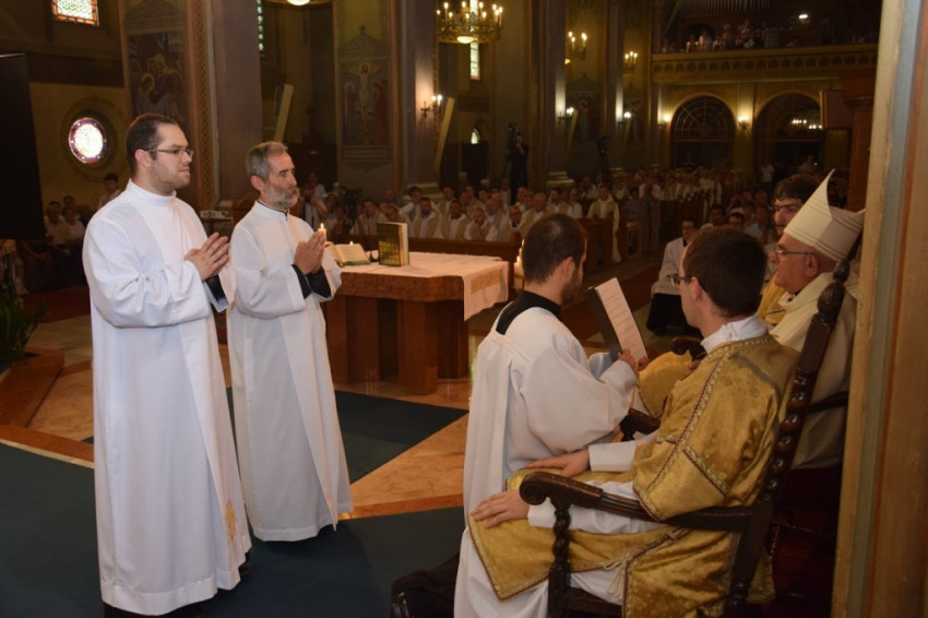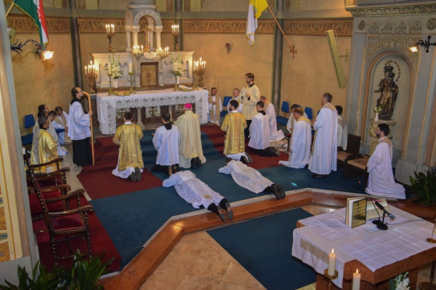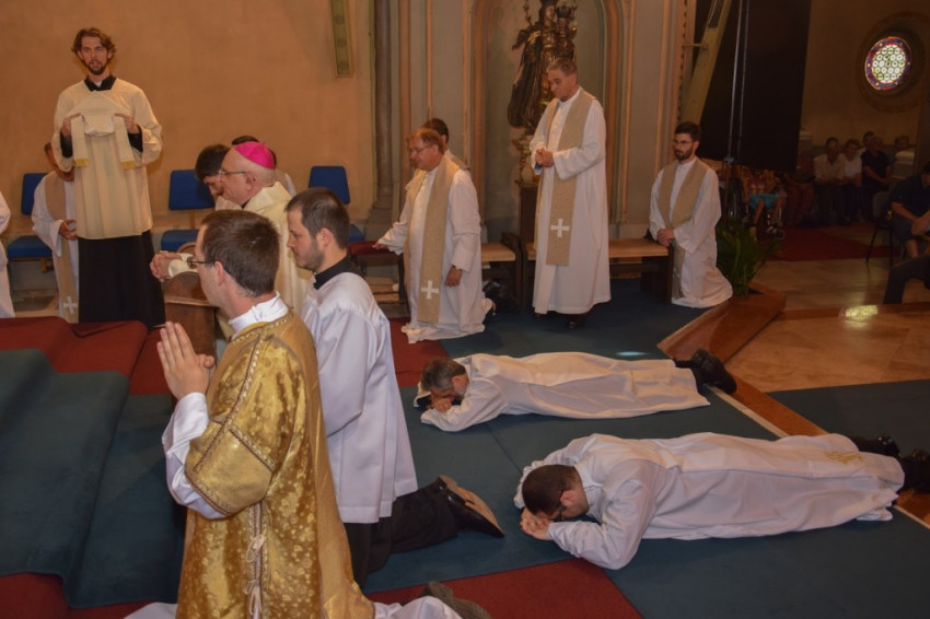 „Legyetek Isten és az emberek előtt feddhetetlenek! Ne hagyjátok, hogy bármi is eltérítsen benneteket az evangéliumtól! A hit szent titkát tiszta lelkiismerettel hirdessétek!” – buzdított a megyéspüspök. A fogadalomtételt a Mindenszentek litániája követte, mely alatt a szentelendők az oltár előtt földre borultak, majd térdelve fogadták a püspöki kézrátételt. A diakónusokat két-két paptársuk öltöztette be.