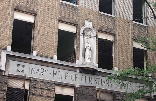 A szép Mária-szobor a gyermek Jézussal a Segítő Szűz Mária Iskola homlokzatát díszítette. Az évszázados múltra visszatekintő szép, régi épület története 2012-ben ért véget, amikor megkezdődött a bontása. Mivel más típusú fejlesztés szerepelt az érsekség és a város vezetőségének terveiben, a történelmi műemlék megőrzése és felújítása helyett az ingatlant eladták, majd az épületeket 2013-ban lebontották.