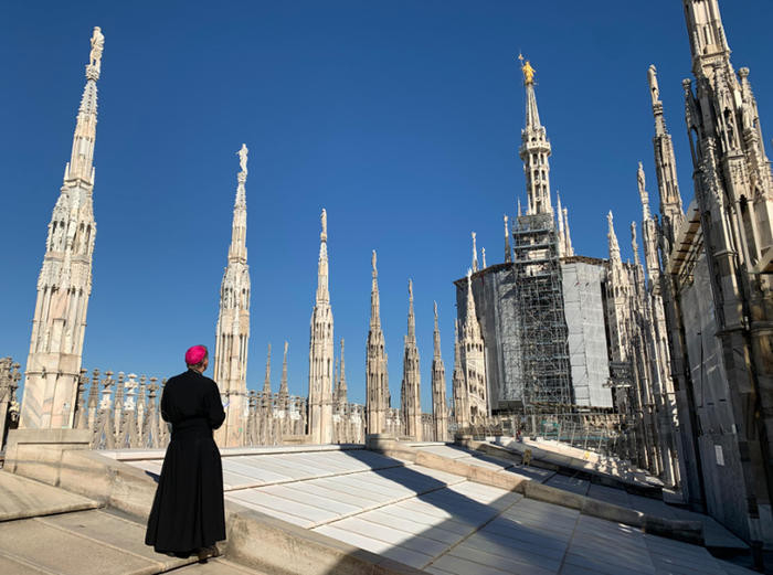 Mario Delpini felment a dóm tetőteraszára és onnan fohászkodott Szűz Máriához – akinek a dóm legmagasabb tornyán, több mint 70 méter magasságban álló szobra Milánó jelképe – egy különleges, soknyelvű közbenjáró imádsággal, amelyben oltalmát kérte a városra a járvány idején.