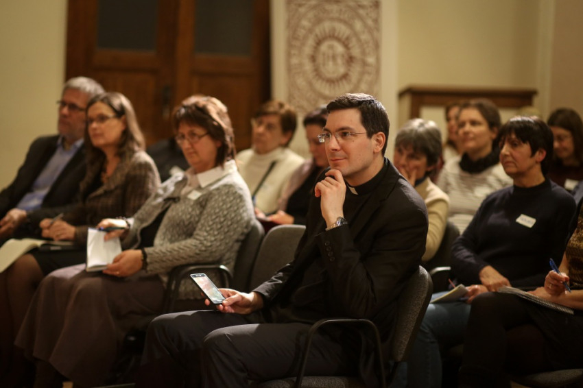 Kató Csaba, az Esztergom-Budapesti Főegyházmegye Hitoktatási Felügyelőségének munkatársa azt a keresztelési segédanyagot mutatta be a résztvevőknek, melyet a főhatóság állított össze. Ebben a kiadványban a szemlélet, az elvi megfontolások és a gyakorlati ötletek szoros összefüggésben vannak. Hét „szereplője” van a segédanyagnak: Isten, a katekéta, a gyerek, a szülők, a lelkipásztor, a plébániai közösség és a keresztszülők.