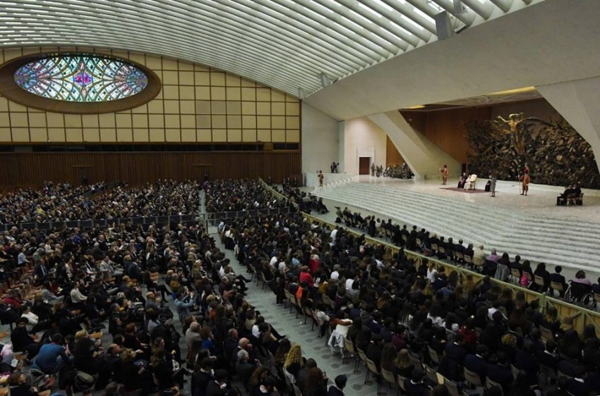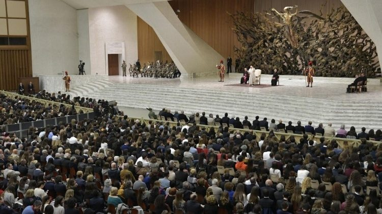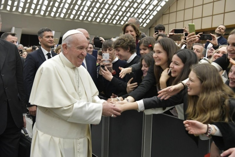 A pápa az iskolai közösség nagy, egyesítő erejére emlékeztette a VI. Pál aulát szinte teljesen megtöltő diákságot. Mint mondta, ez a közösség az oktatás és a nevelés által egyszerre nevel állampolgárrá és kereszténnyé. A Szentatya arra bátorította a fiatalokat, hogy ügyeljenek a civil és keresztény embernek erre az egységére, mert e két aspektus közti szövetséget a világban már megszakították.