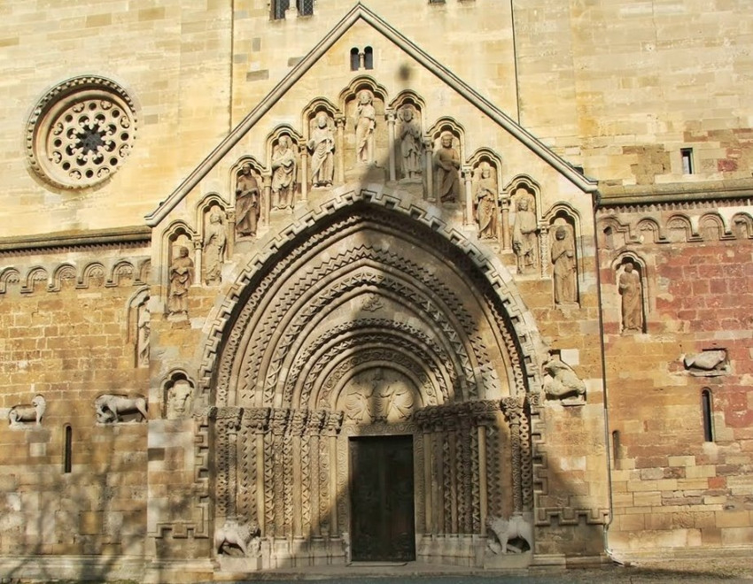 Nyugati homlokzatát toronypár és igen gazdagon díszített bélletes kapu ékesíti. A kapu feletti fülkékben Krisztus és a tizenkét apostol szobra létható. A háromhajós, négy boltszakaszos bazilika nyugati karzattal, keleten félkörívvel zárul. A szentély falát a templom védőszentjének, Szent Györgynek a sátánnal vívott küzdelme díszíti – olvashatjuk a Katolikus Lexikonban.