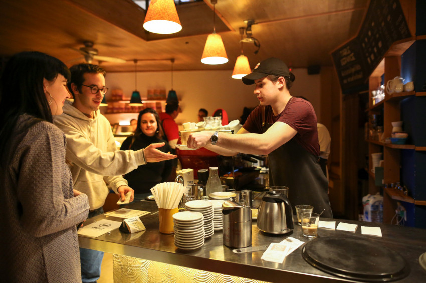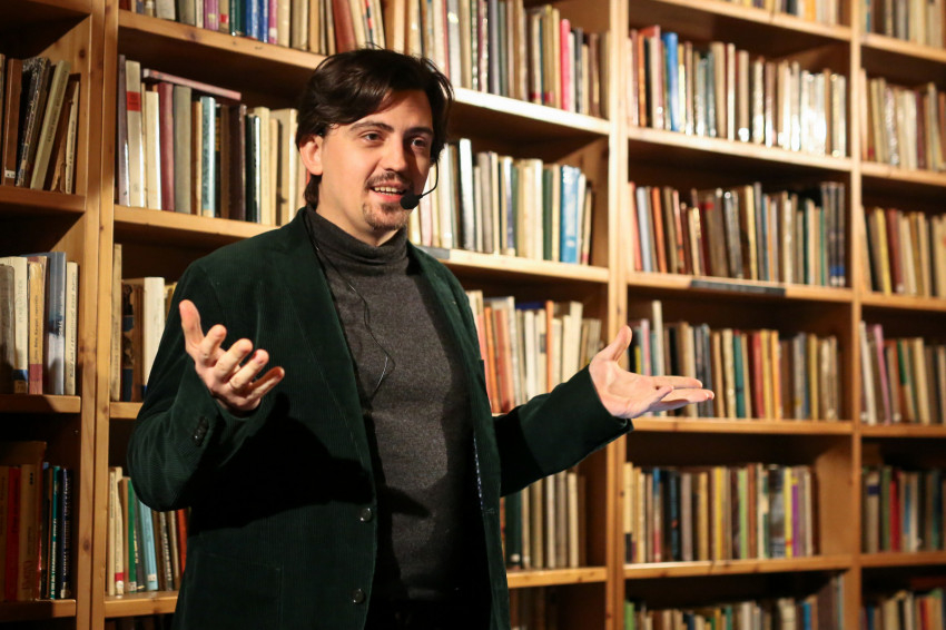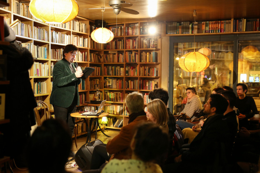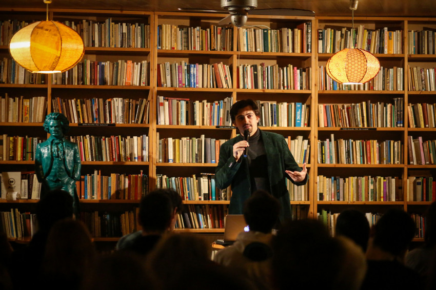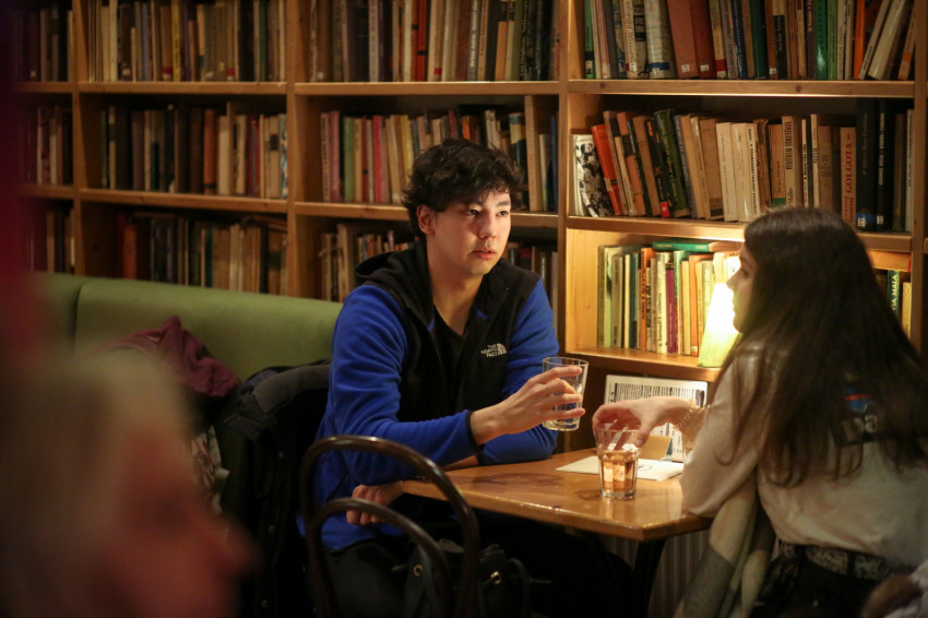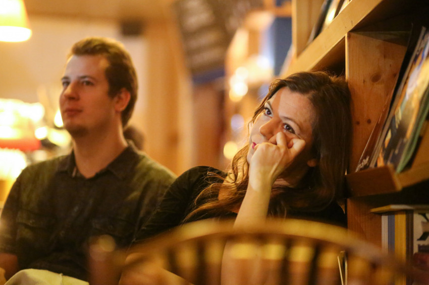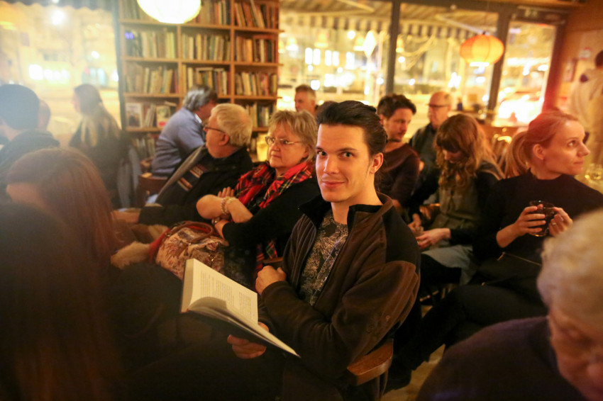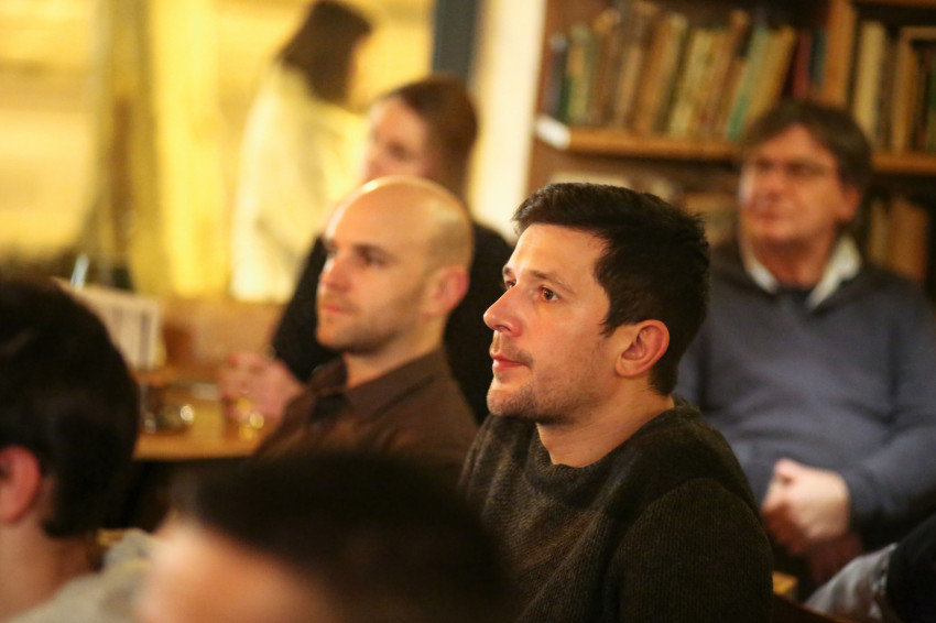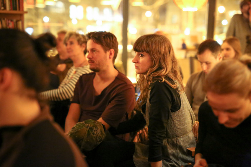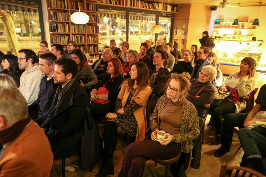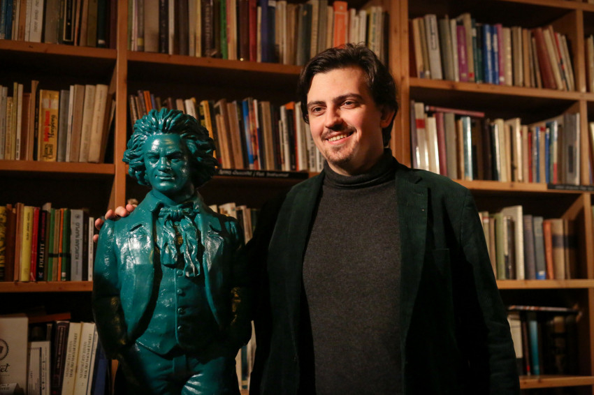 Már este hat óra előtt sokan, többségében fiatalok ültek a kávézó földszintjén, stílusosan Thonet-székeken, és várták türelmesen az előadót. Tóth Endre zenetörténész az említett zöld Beethoven-szobrok egyikét is magával hozta a kávézóba, a német turisztikai hivatal adta kölcsönbe. Előadásának ezt a címet adta: Barátunk lenne-e Beethoven?