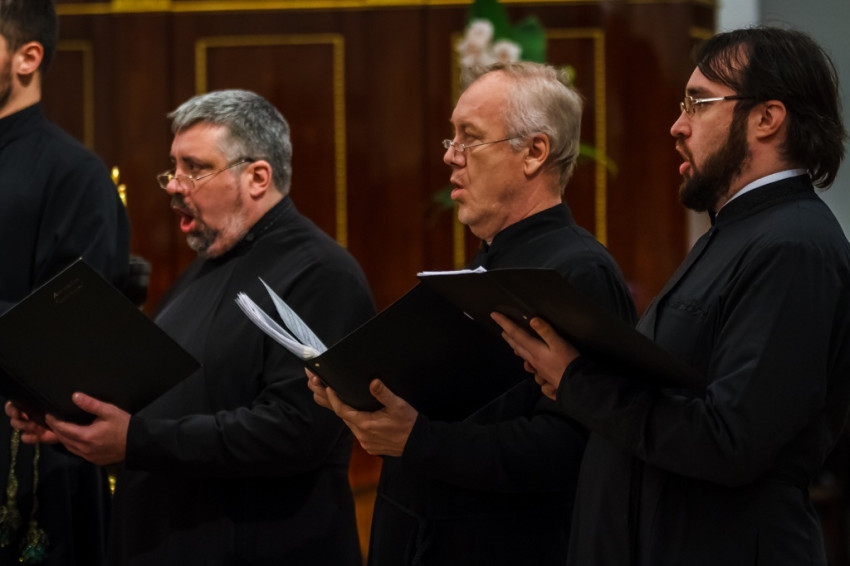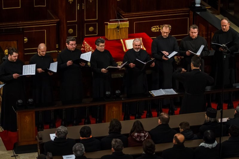 A koncert első felében a Szent Liturgia, a vecsernye és az utrenye (a hajnali dicséret) állandó énekeiből hallhattunk részeket, majd aktuális imádságként – hiszen az orosz ortodoxok most ünneplik karácsony misztériumát – karácsonyi énekek hangzottak el. Fellépésüket a Szent Efrém Görögkatolikus Általános Iskola Lautitia kórusa vezette be Nemes József vezénylésével.