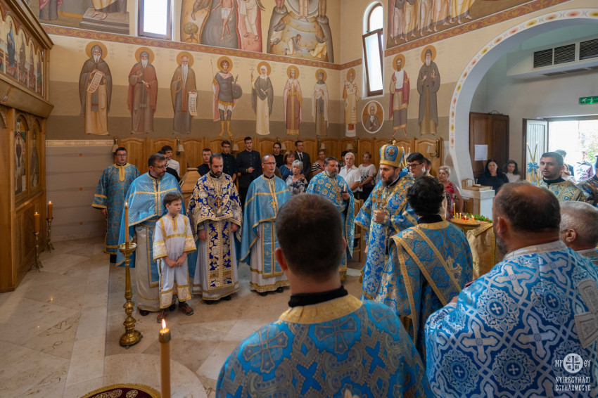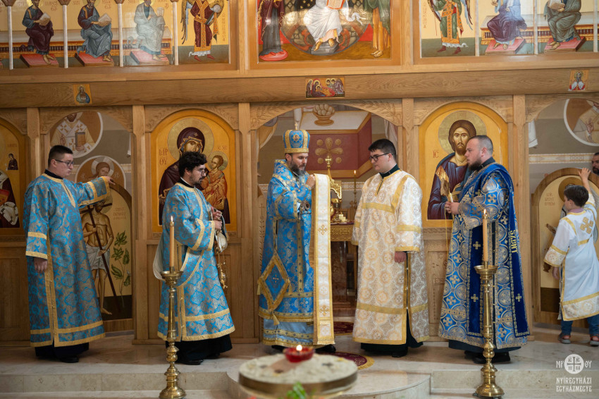 A Szent Liturgiára az Istenszülőt idéző kék színű, liturgikus öltözékben vonult a papság és az asszisztencia a Nyíregyházi Egyházmegye és a Görögkatolikus Papnevelő Intézet közös udvarán.