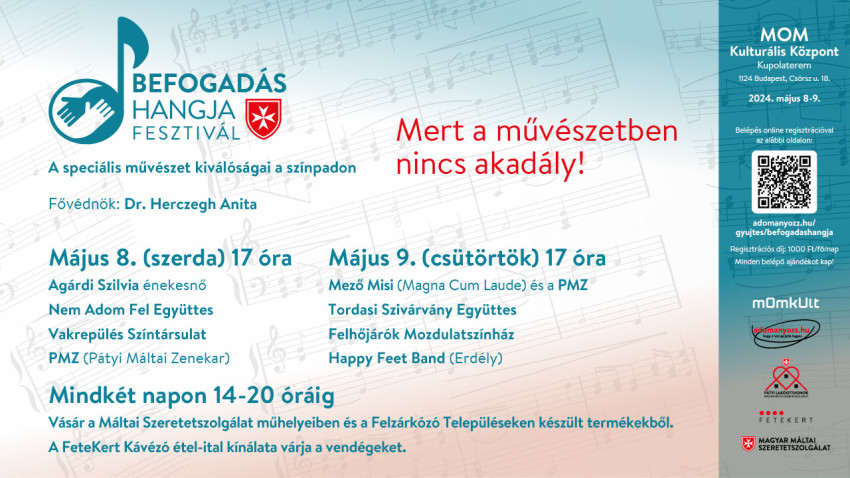 A Máltai Szeretetszolgálat Csilla Háza Páty integrált intézmény ezért idén először szervezi meg a Befogadás Hangja Fesztivált a MOMKult kupolatermében május 8–9-én. A kétnapos eseményen testi és értelmi akadályozottsággal élő, profi művészek és olyan amatőr előadók állnak színpadra, akik számára a zenélés, a színház- vagy mozgásművészet már nem csupán fejlesztő foglalkozás, hanem művészi önkifejezési forma. Az eseményen fellép Agárdi Szilvia énekesnő, a Felhőjárók Mozdulatszínház, a Happy Feet Band, a Nemadomfel Együttes, a Tordasi Szivárvány együttes, a Vakrepülés Színtársulat és a fesztivál házigazdája, a Pátyi Máltai Zenekar (PMZ). A fesztivál második napján a PMZ sztárvendéggel egészül ki, Mező Misi énekes, a Magna Cum Laude frontembere csatlakozik a speciális együtteshez. A fesztivál műsorvezetője József Janka színésznő, televíziós lesz. A zenei élmények mellett a MOMKult előtti téren a Máltai Szeretetszolgálat és a Felzárkóz Települések üzemeiben készült termékekből nyílik vásár. A vendégeket a FeteKert Kávézó várja étel-ital különlegességekkel.