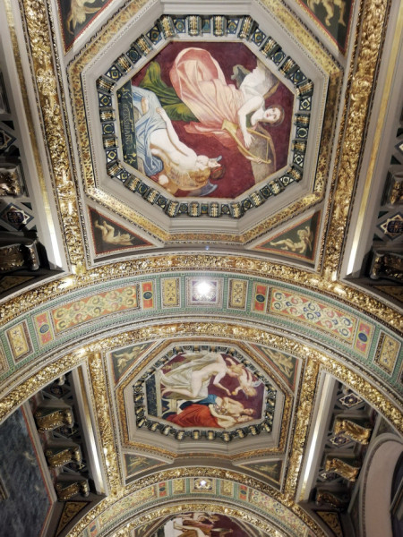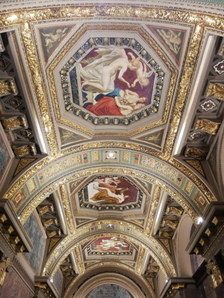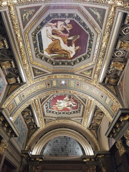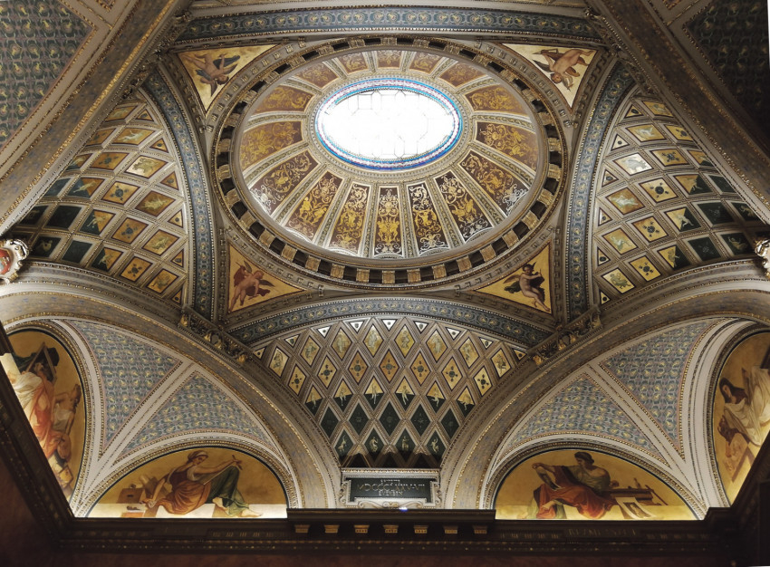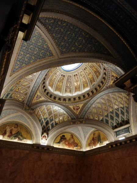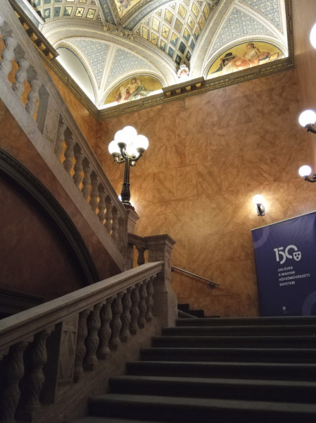 Ilyen fennkölt gondolatok futottak át az agyamon, amikor felmentem az Andrássy úti Régi Műcsarnok épületének első emeletére, és megpillantottam a teljesen kivilágított Lotz-freskókat a mennyezeten. Mint a kristály, úgy ragyogtak a falképek egy ékszerdobozba rejtve, mert a Régi Műcsarnok, amely ma a Képzőművészeti Egyetemhez tartozik, valaha valóban az volt. Kívülről, az Andrássy út felől ma egy koromfekete neoreneszánsz homlokzat látható, amelyet valószínűleg senki sem vesz észre az arra járók közül. Tegyük hozzá, nem csoda, hiszen az elmúlt évszázad benzingőzzel elegyített összes kormos szennye jól beborította. Eddig csak a tetejét újították fel, a fehér báboskorlát csak úgy világít odafönt, a homlokzat teljes hosszában. Remélhetőleg a fekete homlokzati falak is megtisztulnak egyszer a nem túl távoli jövőben.