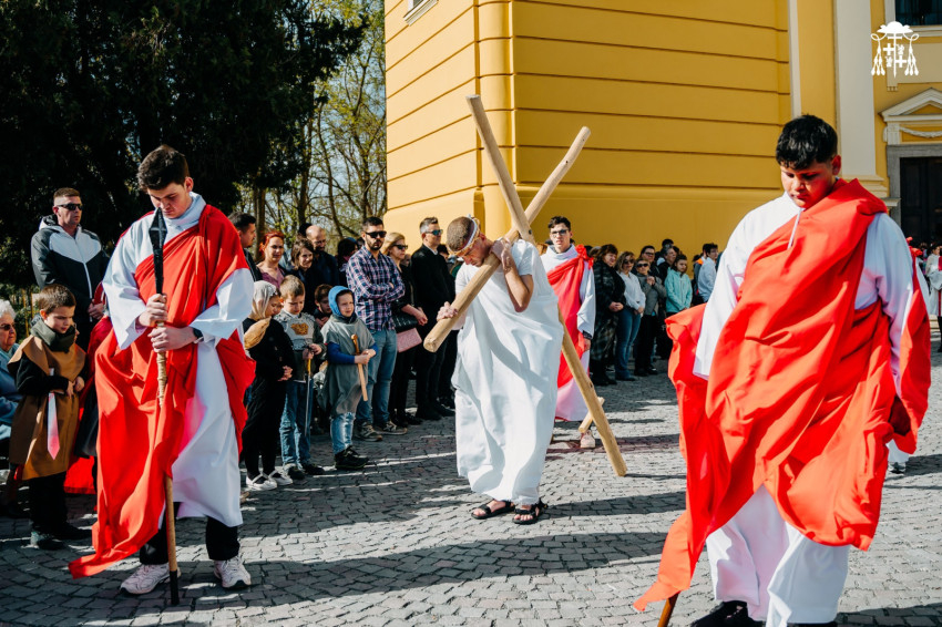 A nagyváradi székesegyház előtt nagypéntek délután közös keresztúti ájtatosságot végeztek a város plébániáihoz tartozó hívek és lelkipásztorok. A keresztút jeleneteit a Szent László Római Katolikus Teológiai Líceum diákjai mutatták be.