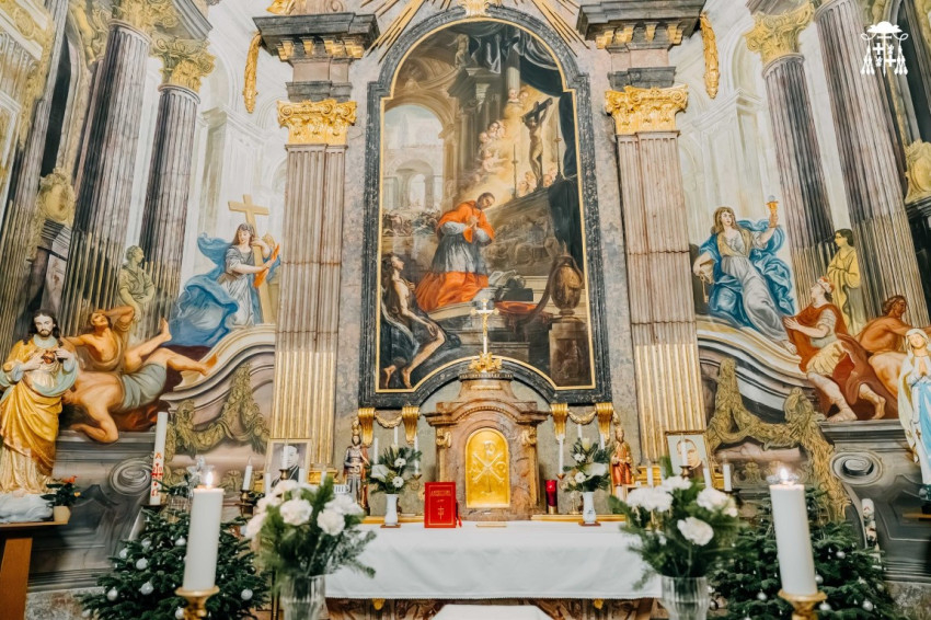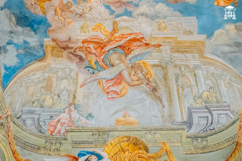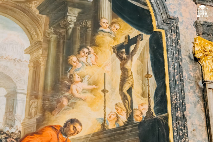 A háttérben kilátás nyílik az oszlopcsarnokos átjárókkal övezett nagyobb épületek felé, az utcára. Két allegorikus kép – a hit legyőzi a bálványimádást és a vallás leigázza az eretnekséget és a gyűlölködést – látható a főoltár két oldalán.