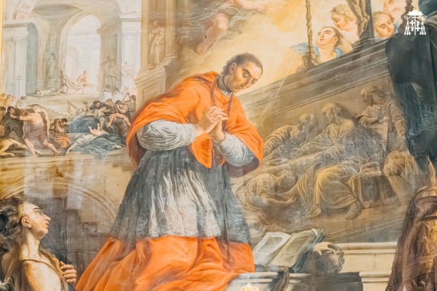 Ebbe a freskóciklusba komponálta bele mesterien a művész az általa festett főoltárképet is, melyen templomi környezetben, az oltár előtt térdelő, a pestisjárvány megszüntetéséért az Istenhez fohászkodó Borromeo Károly alakja látható.