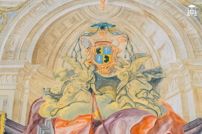 A kápolna püspöki lakosztály felőli bejárata felett, a buzgóság és a kegyesség allegóriái között két nagyobb, szárnyas angyal tartja Patachich Ádám püspöki jelvényekkel övezett címerét.