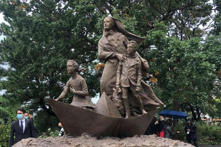 Cabrini anyát, a rend- és iskolaalapítót egy kisfiú és egy kislány társaságában egy papírhajóban ábrázolja az új szobor, a nővér egyik kezében könyvet tart, míg a kisfiúnál egy bőrönd van és egy olasz fúvóshangszer – egyértelmű utalás a számtalan olasz emigránsra, akiknek a támogatására a nővér az Újvilágba érkezett.