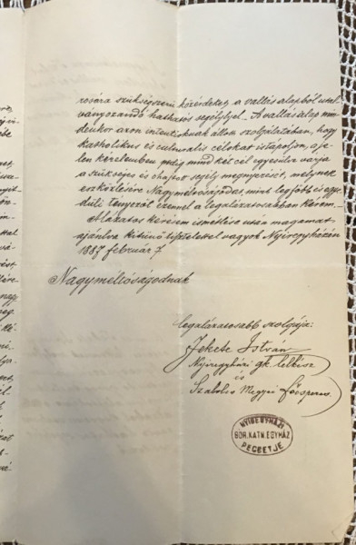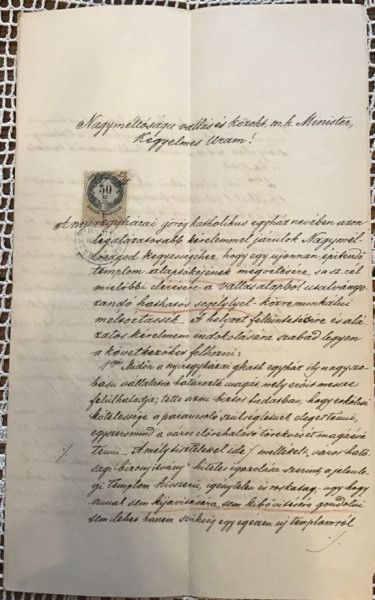 Ezúttal Fekete István főesperes-lelkész 1887. február 7-én írt kérvényét olvashatjuk a Nyíregyházán újonnan építendő görögkatolikus templom támogatására.