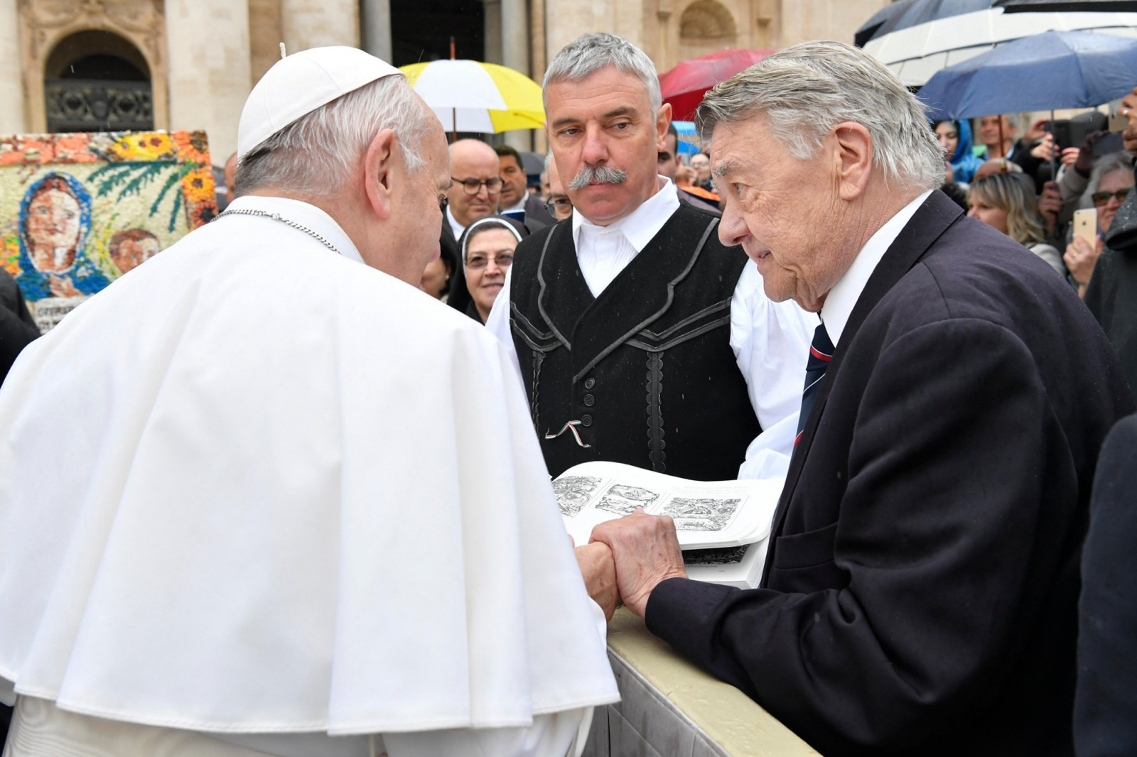 Átadták a Szentatyának az erdélyi helyek ikonográfiáját bemutató könyvet, majd a pápa áldását kérték az erdélyi magyarokra.