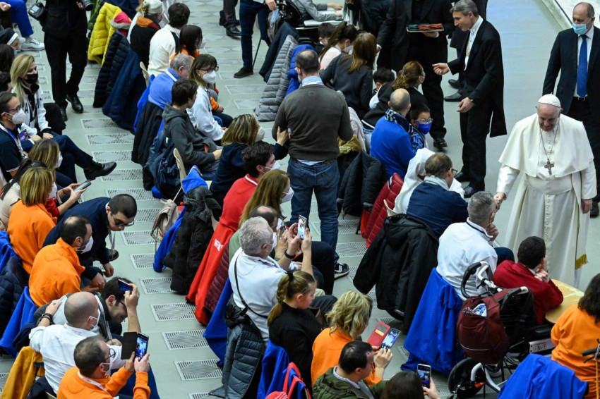 Ferenc pápa köszönetet mondott viszontlátogatásukért, hiszen nyolc éve, 2013-ben találkozott velük, Assisiben tett első zarándoklata alkalmával. A Szentatya örömmel emlékezett vissza a Szent Ferenc nyomában tett útjára, melynek során megölelhette az intézet gyermekeit, ahogy Szent Ferenc tette, megölelve a leprás beteget, ami – az assisi szent végrendelete szerint – elindította a megtérés útján. Miként Jézus tette, Ferenc is lehajolt a betegek és kitaszítottak sebeihez, hogy felhívja a társadalom figyelmét a „leselejtezés kultúrájára”, mely kevesek kezében halmozza fel a gazdagságot, míg nagyon sokan peremre szorulnak, és szűkösen, adományokból élnek.