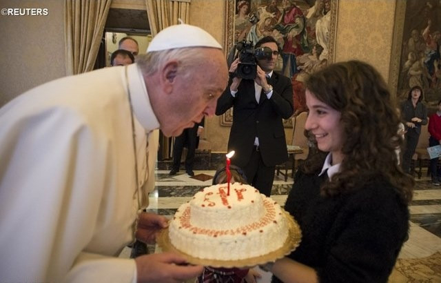 A gyerekek örömmel köszöntötték a pápát 79. születésnapján, és tortával kedveskedtek neki. Kórusban énekelték: „Auguri, Papa Francesco!” („Isten éltesse, Ferenc pápa!”)