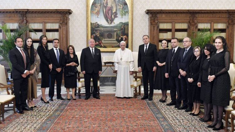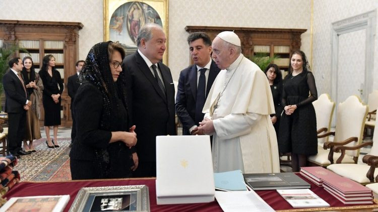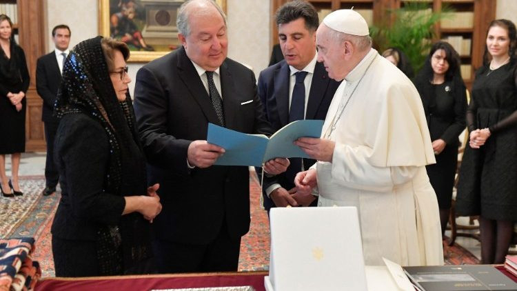 A Szentatya a 2021-es béke világnapi üzenetét, apostoli buzdításai és enciklikái egy-egy példányát, valamint „A virágzó sivatag” című képet ajándékozta Armen Szarkiszján államfőnek.