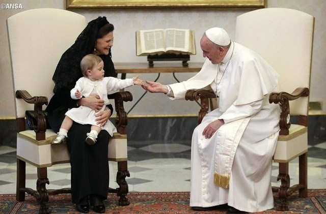 A látogatás végén az ajándékcserét és a hivatalos fotót követően a svéd kíséret eltávozása után a Szentatya a pápai könyvtárban maradt beszélgetésre a svéd királyi család tagjaival, miközben a nagymama ölében ülő kisbaba Ferenc pápa kulcstartójával játszott.