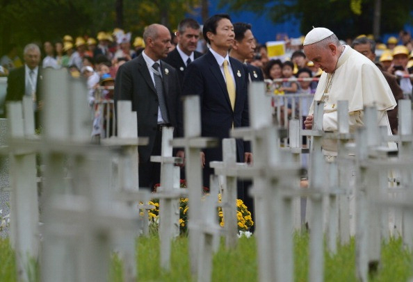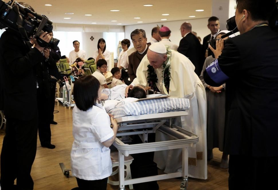 A látogatás végén a pápa a Szeretet Iskolája felé vette útját nyitott pápamobilján, de útközben néhány perces imára megállt az elvetetett gyermekek emlékére létrehozott kertnél. Jelen volt a koreai életvédő mozgalom képviselete, valamint Lee Gu-won testvér, kar és láb nélküli misszionárius.