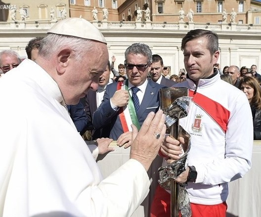 A Pro Pace et Europa Una fáklyát („A békéért és Európa egységéért”) 300 fős küldöttség vitte a Vatikánba. Ferenc pápa hálájának adott hangot a kezdeményezésért, és arra buzdította a delegáció tagjait, hogy mindig emeljék a magasba a nyugati monachizmus atyjának értékeit, aki kijelölte a helyes utat Európa népei számára. A Norciából, Subiacóból és Montecassinóból érkezett küldöttség megajándékozta Ferenc pápát Szent Benedek regulájának új kiadásával.