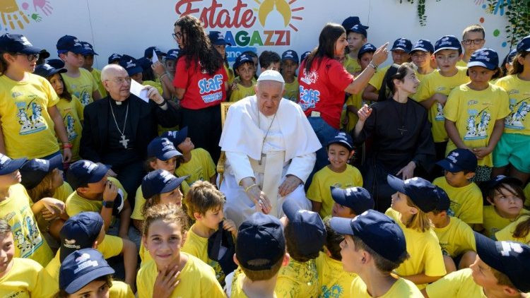 Ferenc pápa ezután a gyerekekhez ment, akik a kis zöld sportpályán ülve várták, „Köszönöm” – feliratú táblákkal a kezükben. Öten közülük kérdéseket tettek föl a Szentatyának. Elsőként a legkisebb, Paolo: „Kik voltak a lovagjai, amikor kicsi volt?” – kérdezte, utalva a tábor idei témájára: „Kóbor lovagok”. Ferenc pápa azonnal rávágta: „A szüleim”. Ezután felidézett néhány gyerekkori emléket Argentínából, amikor négy testvérével az asztalnál ültek, anyukájával és apukájával, akik tanították őket a dolgokra. „A szülők, a család által növekedünk” – mondta, majd a nagyszülők fontosságát emelte ki.