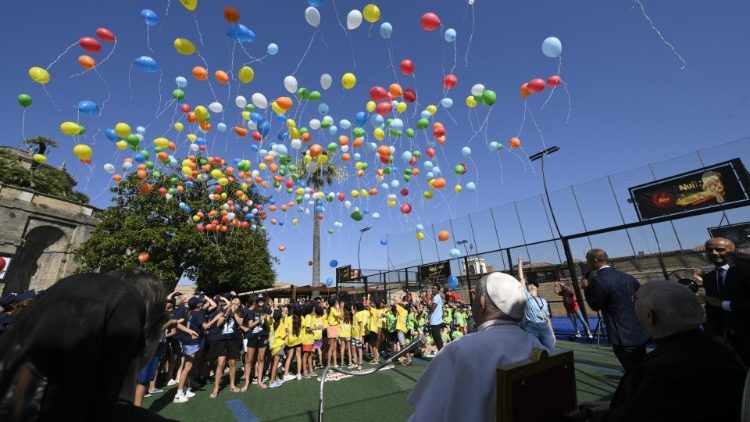 Később, a táborban a pápát Fernando Vérgez Alzaga bíboros és Raffaella Petrini nővér, Vatikánvárosi Állam Kormányzóságának elnöke és főtitkára fogadták. A gyerekek eközben padelt játszottak, kártyáztak, a medencében ugráltak, majd felhangzott a tábor himnusza, és nagy taps tört ki a Szentatya érkezésének hírére.