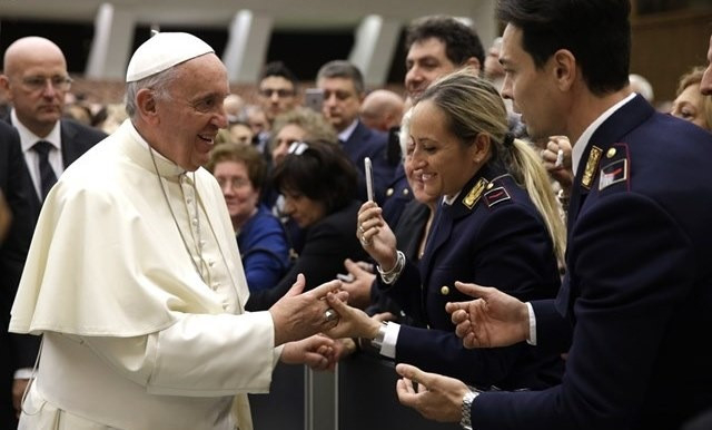 A rendőrség által végzett tevékenység ezekben az években határozottan hozzájárul a menekültáradat hatásának kezeléséhez. Élen járnak a háborúk és üldözések elől Olaszországba igyekvő bevándorlók elsődleges fogadásában, illetve a gátlástalan emberkereskedők elleni fellépésben – hangsúlyozta a pápa.