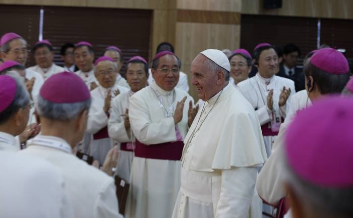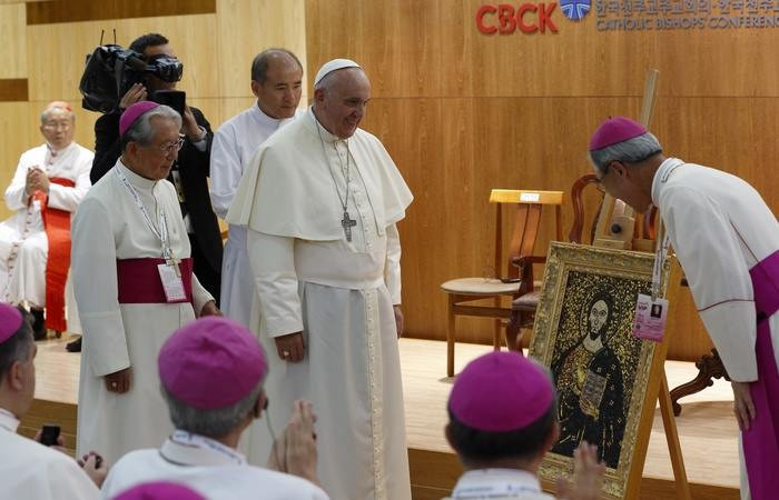 Ferenc pápának a koreai püspökökhöz intézett beszédéből a szentszéki szóvivő kiemelte: a hivatalos szöveg három kiegészítéssel hangzott el. A pápa arra hívta a főpásztorokat, hogy ne engedjenek a klerikalizmus kísértésének, figyelembe véve, hogy a helyi egyházat világi hívők alapították. Továbbá javasolta nekik, hogy álljanak közel a plébánosokhoz és a papokhoz, támogassák őket lelkipásztori szolgálatukban. A harmadik szóbeli kiegészítés pedig az volt, hogy az egyház legyen szegény a szegények között, mert egy erős egyház egy ilyen fejlett országban ne a gazdasági tényezőkre figyeljen.