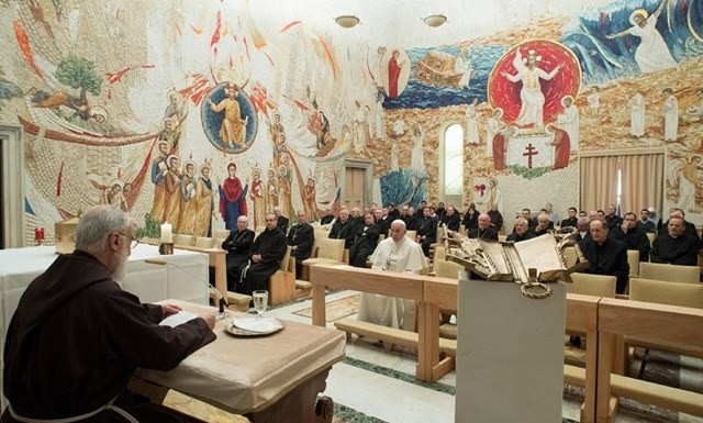 De mit is jelent a számukra mindez? – tette fel a kérdést az elmélkedése végén a kapucinus szerzetes. Sajátos módon van egy közös hangja a Máriára tekintésnek, mely átível a századokon. Origenésszel kezdve, Szent Ágoston, Szent Bernát és a többiek mind mondják, hogy „mit is használ nekünk, ha egyszer Krisztus megszületett Betlehemben Máriától, ha a hit által nem születik meg a mi szívünkben? Szent Ambrus így kérdez: „Hol születik meg Krisztus, ha nem a lelked és a szíved legmélyén?” Az egyház soha nem felejtette el ezt a személyes jelleget, a modern korban sem. XXIII. Szent János pápa 1962 Karácsonyán, a zsinat megnyitása után így imádkozott: Óh, Atya örök Igéje, Isten Fia és Mária Fia, újítsd meg lelkünk mélyén ma is a te születésed csodálatos titkát!” Cantalamessa atya adventi beszédsorozatának utolsó részét az egyház legősibb, harmadik századvégi himnuszának az idézésével zárta, melyben így imádkozunk: „Sub tuum praesidium confugimus, Sancta Dei Genetrix - Oltalmad alá futunk, Istennek Szent Szülője” . Az a “Dei Genetrix” kifejezés azt jelenti, hogy Isten Szülője, Istennek az Anyja. Végül áldott Karácsonyt kívánt a szónok Ferenc pápának és munkatársainak.