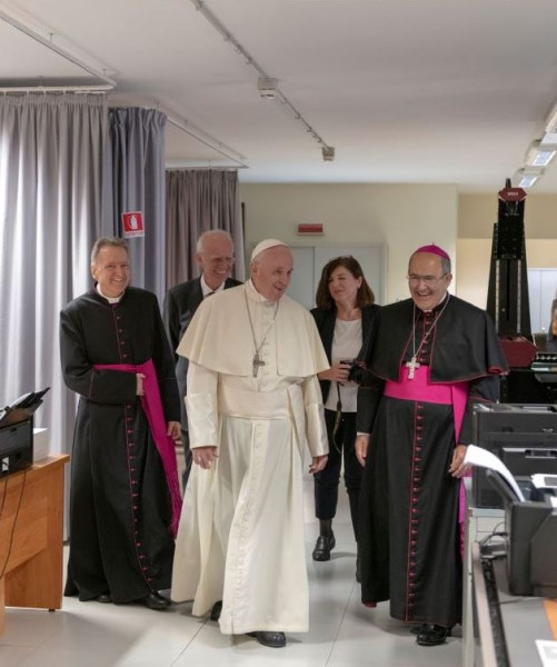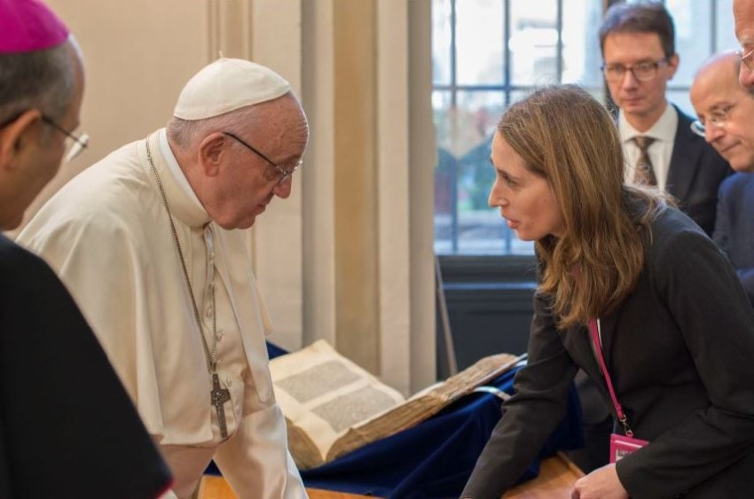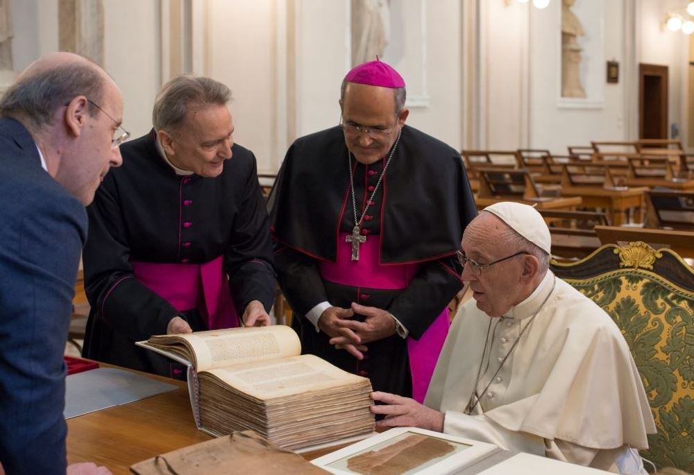 Ferenc pápát a váratlan látogatásra elkísérte José Tolentino Calaça de Mendonça érsek, a Vatikáni Titkos Levéltár levéltárosa és a Vatikáni Apostoli Könyvtár könyvtárosa, illetve Cesare Pasini prelátus, a könyvtár prefektusa. A Szentatyának megmutatták a legrégebbi köteteket, valamint a legmodernebb részleget, ahol a szövegek digitalizálását végzik.