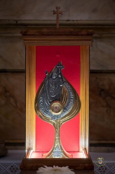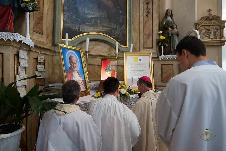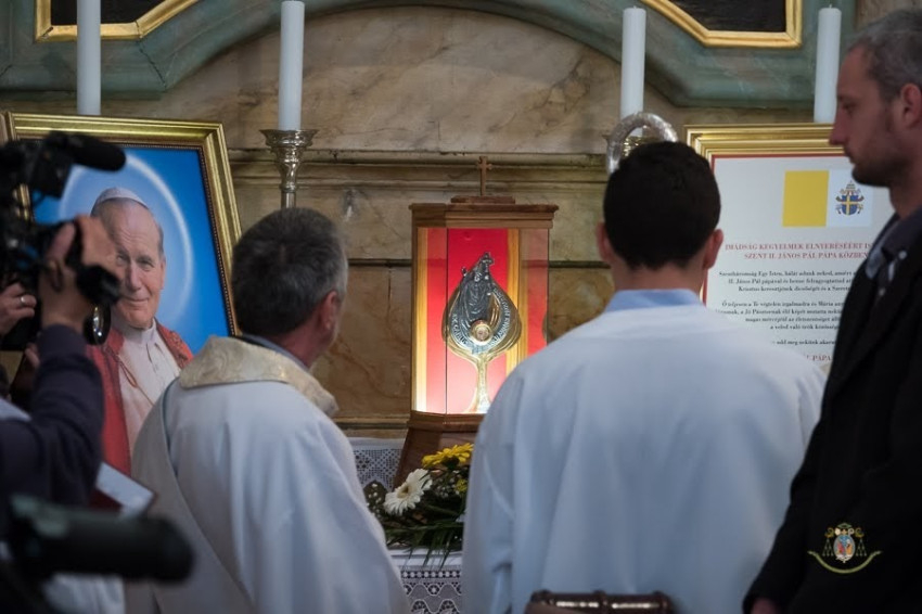 Az ereklyét Rózsa László tolnai születésű, de a Váci Egyházmegyében szolgáló állandó diakónus ajándékozta a templomnak, aki Mieczysław Mokrzycki lembergi érsekhez, Szent II. János Pál pápa egykori személyi titkárához fűződő régi barátsága révén jutott a relikviához. A hajereklye mellett annak certifikációját és a pápa képmását is elhelyezték a mellékoltáron.