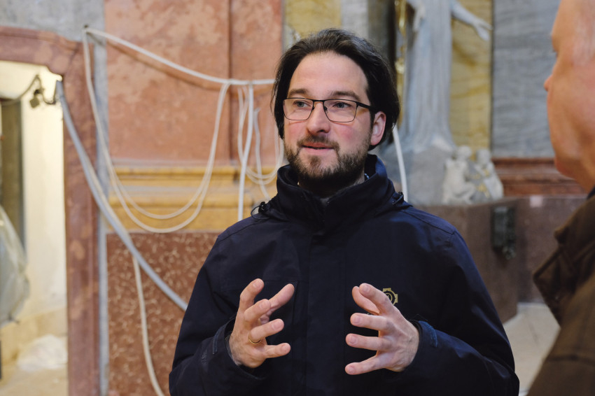 „Kiterjesztett kutatással indítottunk. Ha úgy álltunk volna hozzá a felújítási munkához, hogy ez pusztán csak restaurálás, az nem vezetett volna eredményre – kezdte a templom bemutatását az igazgató. – Minden olyan információval rendelkezünk kellett, ami alapján meghatározhattuk a helyreállítás alapelveit. Első lépésként felmértük, hogy mink van, és mit szeretnénk felújítani. El akartuk kerülni, hogy később derüljön ki, van még pótolni való. Ezért készítettünk egy értékleltárat, amely az építéstörténeti tudományos dokumentáció része, és egyébként kormányrendelet írja elő. Ezt a leltárat azonban, amely több mint nyolcszáz tételből áll, az előírásnál jóval részletesebben dolgoztuk ki. A szőnyegektől a karnisokon át a mennyezetképekig a templom valamennyi értékét végigvettük, a tárgyakkal és állapotukkal kapcsolatos minden adatot rögzítettünk. Ez a lista határozta meg a munka további menetét. Segítségével áttekinthettük, pontosan milyen műtárgyaink vannak, és ezekhez milyen restaurátorok együttműködésére lesz szükség. Szakágak szerint csoportosítottuk a feladatokat: kő-, műmárvány-, mennyezetkép-, táblakép-, szobor-, fa-, fém-, papír-, textilrestaurálási munkálatok. Emellett persze építészeti generáltervezésre is sor került, még most is folynak építőmesteri munkák, és épületgépészeti beavatkozások is történtek a kor elvárásainak megfelelő, modern kivitelben. Műemlék épületen végzett munkálatok esetében nagyon fontos figyelembe venni azt az alapelvet is, hogy a műemléknek részét képező minden egyes tárgynak önálló története is van, amelyhez sok esetben hozzátartoznak a megrendelői igények tekintetbe vételével lezajlott korábbi átalakítások, restaurálások. Mindezt fel kell tárni, így nem csak a helyszínen vallatjuk a műtárgyakat, hanem minden lehetséges forrásnak is utánanézünk.”
