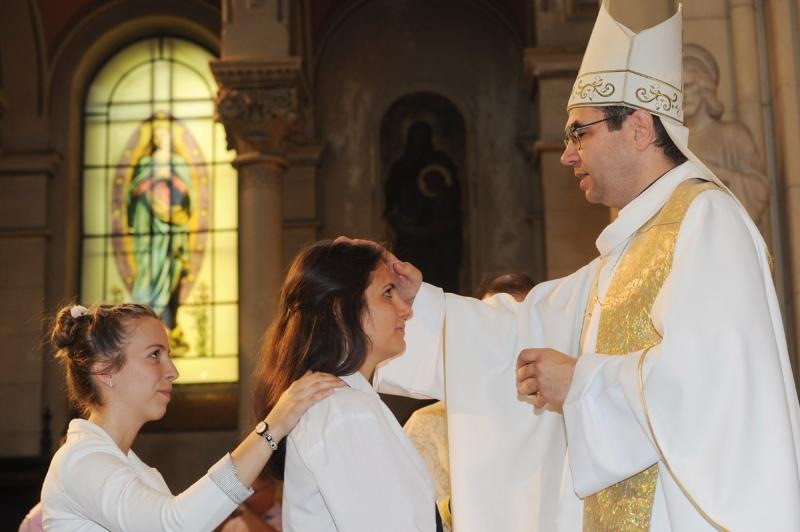 Székely János püspök szentbeszédében a kereszténységükben is nagykorúvá váló bérmálkozókat arra buzdította, hogy a jövőben kiapadhatatlan forrásai legyenek a hitnek életük minden területén, barátságokban, munkájukban, jövendő családjukban. Ezután krizmával való megkenéssel és a „Vedd a Szentlélek ajándékának jelét!” szavak kimondásával a bérmaszülők által az oltárhoz kísért leányoknak kiszolgáltatta a szentséget.