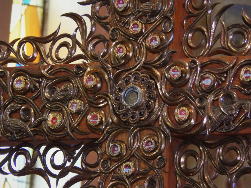 A tölgyfa kereszt Ozsvári Csaba ötvösművész (1963–2009) alkotása, 2007-ben készült, 3,2 méter magas, bronzborításokkal díszített; középpontjában ezüsttokban Szent Kereszt-ereklye van elhelyezve, melyet a leveles díszek fordulataiban magyar, illetve magyar vonatkozású szentek ereklyéi vesznek körbe.