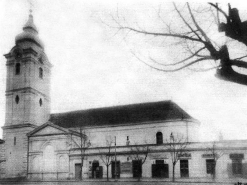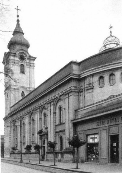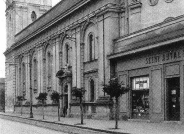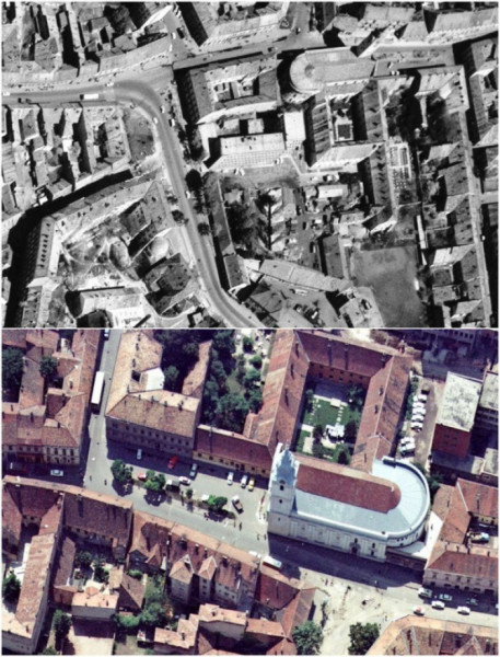 A ferences templom és a hajdani kolostor egy 1969-ben és egy 1975-ben készített légi felvételen a még meglevő bazársori összekötő épülettel (plébániahivatal)