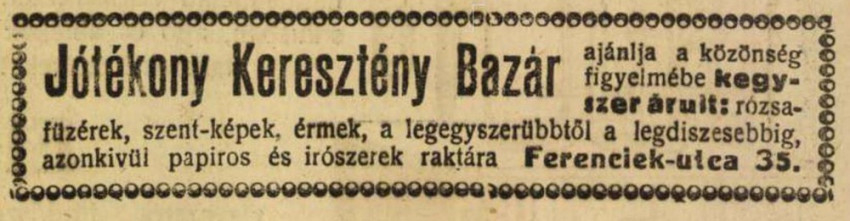 A Jótékony Keresztény Bazár Rt. hirdetése